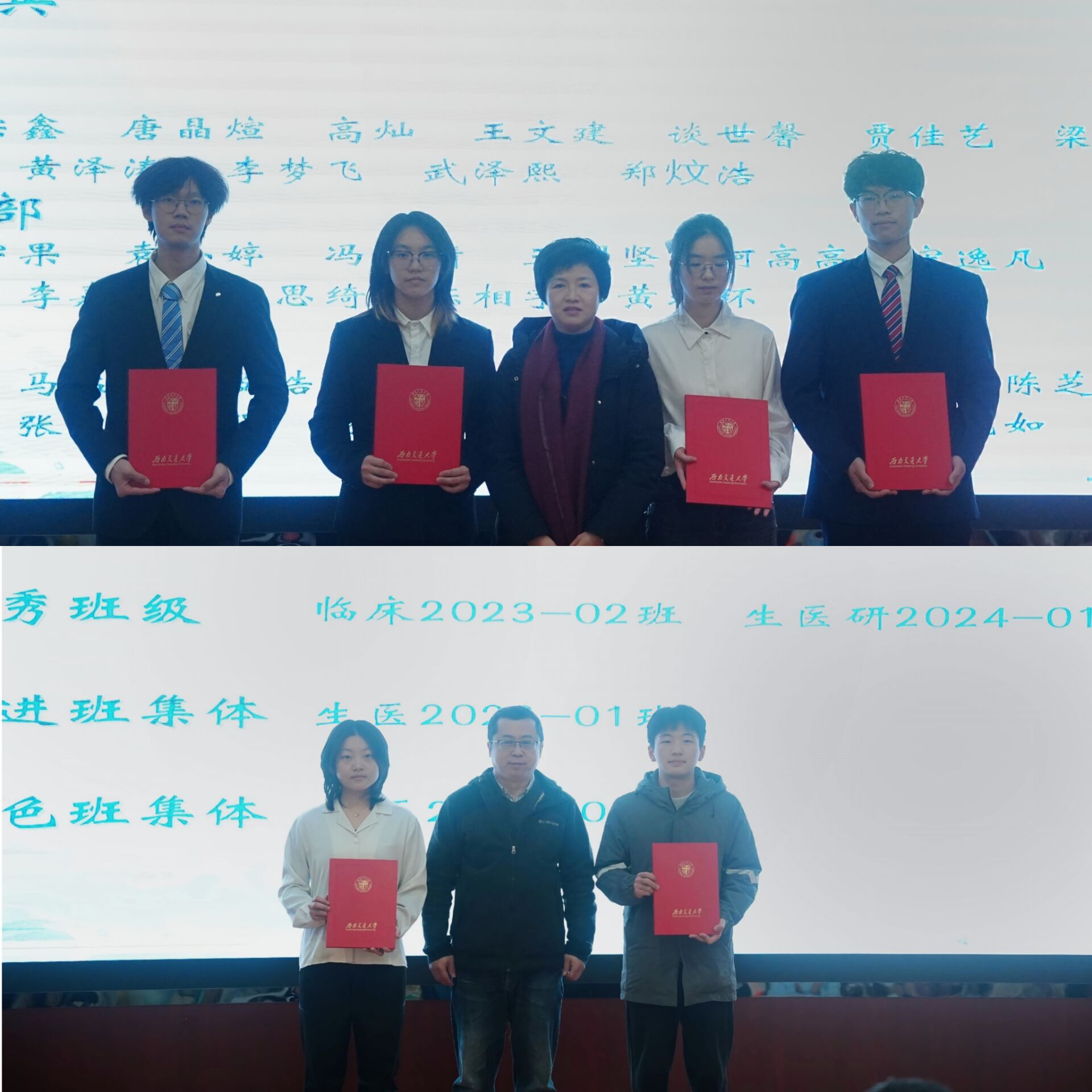 2025年优秀集体及个人名单,获奖代表们身着正装登台领奖,接受全场师生的致敬与祝福,又学院党委书记曾东红以及副院长冷永祥分别为获奖个人及集体颁发证书。从课堂上的勤学善思到实验室的潜心钻研,从志愿服务的无私奉献到校园活动的积极担当,这些优秀榜样用实际行动践行着“医工结合,健康中国”的初心,他们的故事不仅是对过往努力的肯定,更为新生们树立了前行的标杆,让奋斗的种子在每个人心中生根发芽。